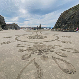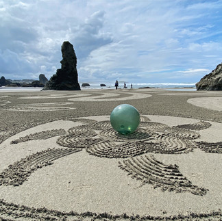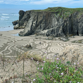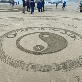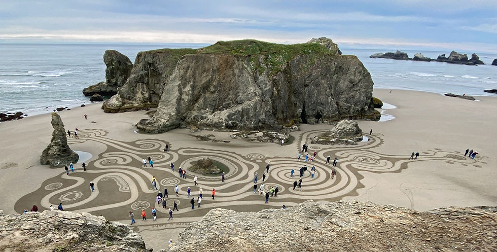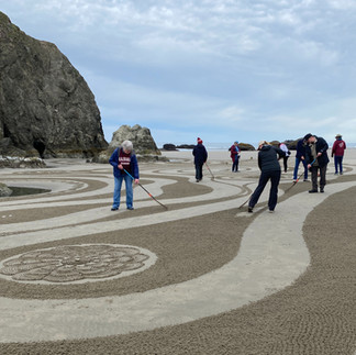 We couldn't have asked for better conditions to open our summer season, well, mostly. Sunday and Tuesday were ideal, and drawing in front of Cathedral Rock reminded us all why we keep coming back to this remarkable stretch of Oregon coast year after year. Monday had other ideas: the rain arrived right before walk time, softening the artwork considerably. The paths, though, held up better than we could have expected. And the walkers? They showed up anyway, damp and undeterred, which honestly made the day one of the most memorable of the series. The labyrinth paths evolved just as they should, steady, deliberate, and full of quiet wonder, rain and all.