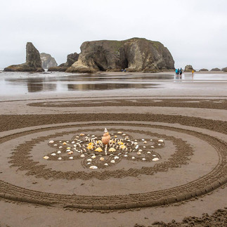 Throughout this summer season at Circles in the Sand, children and adults alike have come looking for Jacque, the Shell Lady. One little girl arrived with her family, a special shell in hand, looking to contribute it to a mandala of shells and stones, feathers and discs of brightly colored glass that everyone has come to recognize as Jacque’s signature. Jacque's shell art was always the exclamation point at the end of each labyrinth.